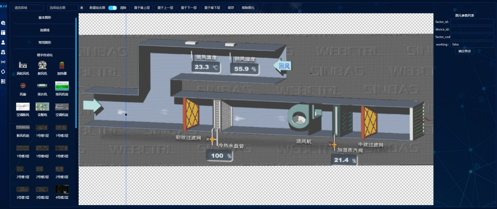 通過搭建組態環境,與現實采集設備進行邏輯關聯,結合三維地圖,將工業生產過程直觀的展現給用戶,通過設計相關工業生產邏輯規范,及預警參數,能夠實時進行監控展示,對于異常情況能夠第一時間展示在基于三維的自動控制系統中。